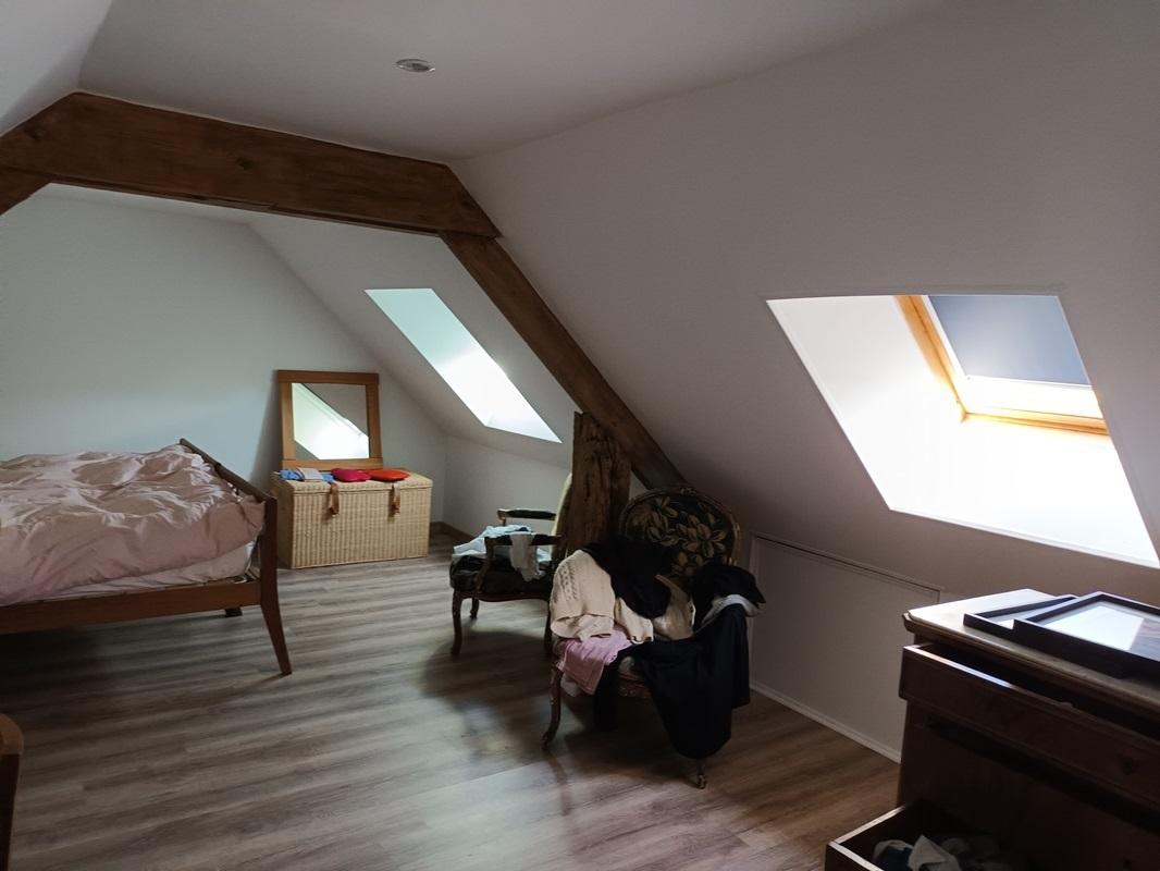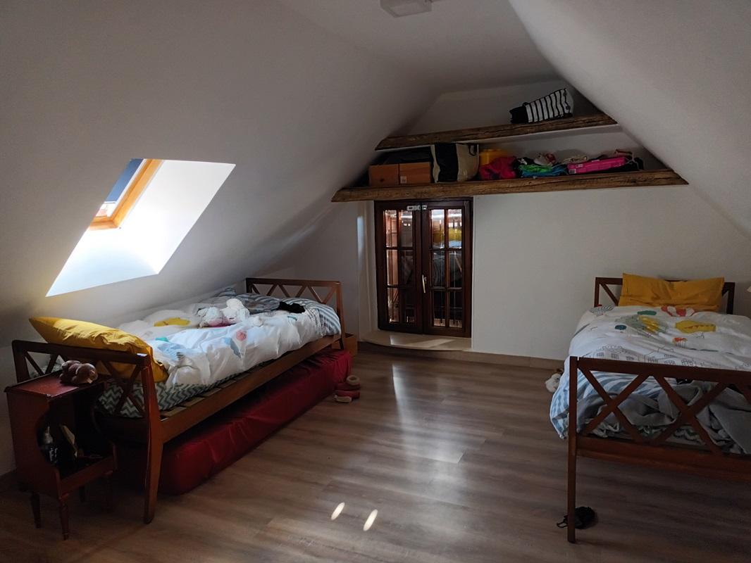 Accès à l'étage par une échelle meunière : un palier, deux chambres, une salle de bain.