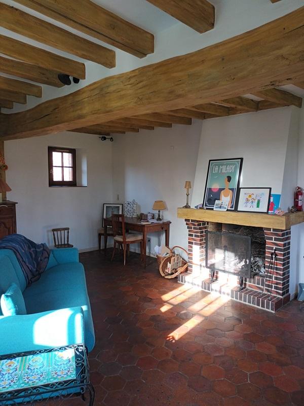 Au rez-de-chaussée : un salon avec une cheminée, un dégagement donnant accès à une salle de bains et un WC, une cuisine aménagée et équipée ouverte sur un séjour.